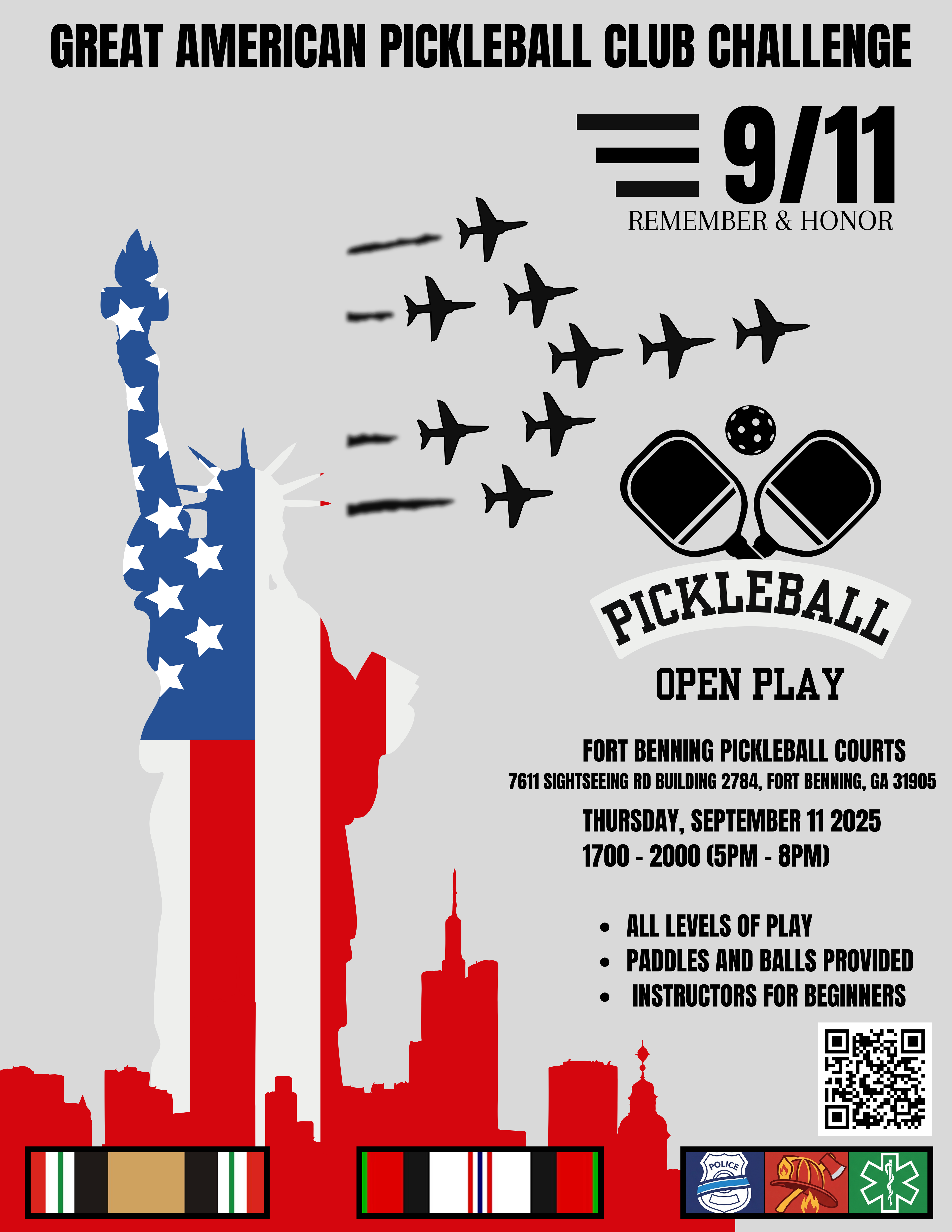Over 500 pickleball clubs and thousands of players across the United States will play pickleball on the 9/11 anniversary. This is a country-wide satellite event where Columbus / Fort Benning players join hundreds of other clubs who will also play the same day!