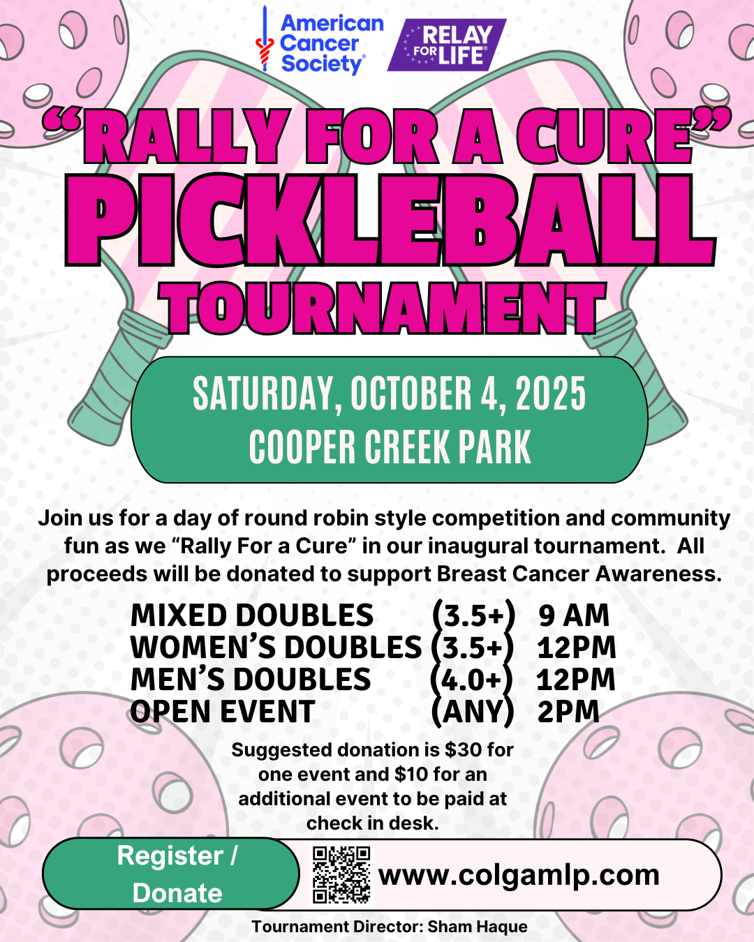 Get ready to dink for a cause, Columbus! Join us for an exhilarating doubles pickleball tournament right here in Columbus, Georgia, all to raise vital funds and awareness for breast cancer. We will have 8 teams compete in a round robin format in four divisions (Men's 4.0+, Women's 3.5+, Mixed 3.5+, and an Open Event). It's your chance to smash, volley, and celebrate, knowing every point helps in the fight against this disease. Grab your partner, practice your serves, and let's make a real difference, one thrilling match at a time!
